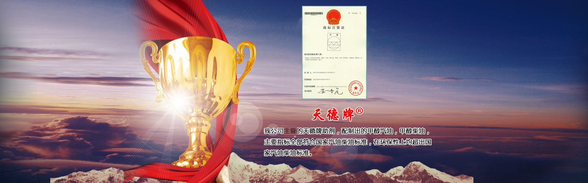 本公司主要產(chǎn)品有甲醇汽油添加劑、甲醇柴油添加劑、車(chē)用復(fù)合柴油添加劑、甲醇燃料油添加劑以及雙燃料控制器和油罐除水劑六大系列九種產(chǎn)品,具有廣闊的市場(chǎng)空間和經(jīng)濟(jì)效益。其中添加劑系列已在國(guó)家商標(biāo)局注冊(cè)為“天德牌”,天德牌問(wèn)世二十多年來(lái),在保證產(chǎn)品質(zhì)量的同時(shí),給廣大客戶(hù)帶來(lái)了可觀的經(jīng)濟(jì)利益,得到廣大油品行業(yè)用戶(hù)的一致好評(píng)…… 了解更多+